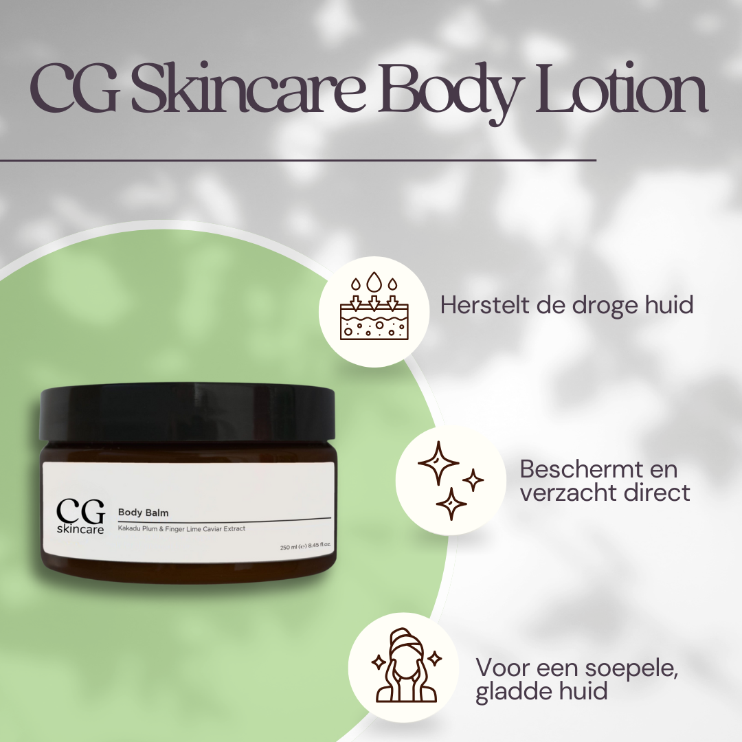 De Aloë Vera-gebaseerde Body Balm van CG Skincare zit boordevol antioxidanten en vitamine C, B en E om de huid te beschermen. Met Coconut, Kakadu Plum en Finger Lime Caviar Extract is het een effectieve, lichtgewicht moisturizer voor zowel je gezicht als lichaam. De balsem is licht en wordt gemakkelijk opgenomen, waardoor je huid er frisser, jonger en gladder uitziet.